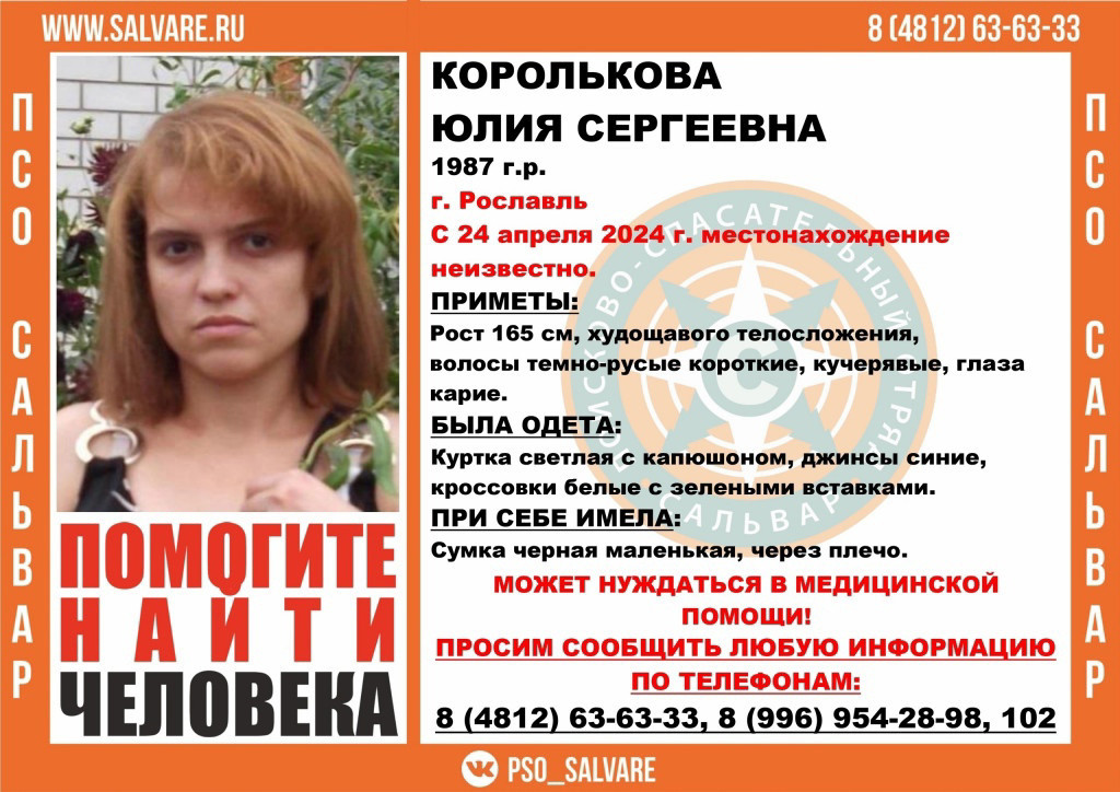 Поиски 37-летней Юлии Корольковой объявили в Рославле Смоленской области. Об этом сообщает ПСО «Сальвар».