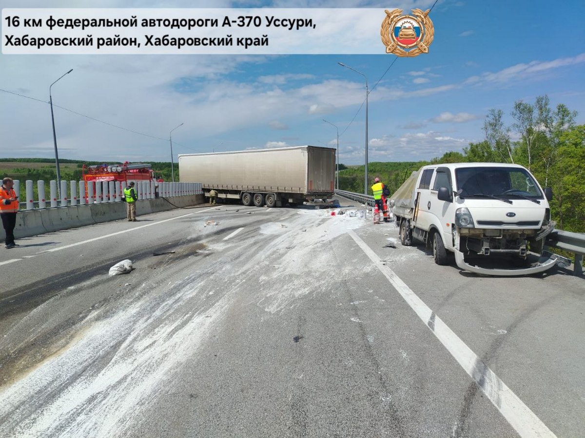 В Госавтоинспекции Хабаровского края сообщили, что виновником ДТП, которое случилось на 16 километре автотрассы «Хабаровск – Владивосток», стал водитель большегруза «Ситрак», ехавший со стороны дальневосточной столицы. Он, не обеспечив постоянный контроль за движением, врезался в попутный «Киа Бонго», который двигался медленно, так как наносил дорожную разметку. В последний момент дальнобойщик предпринял попытку уйти от столкновения и экстренно затормозил. Это увенчалось тем, что большегруз ударился о барьерное дорожное ограждение и перекрыл всю ширину проезжую часть.