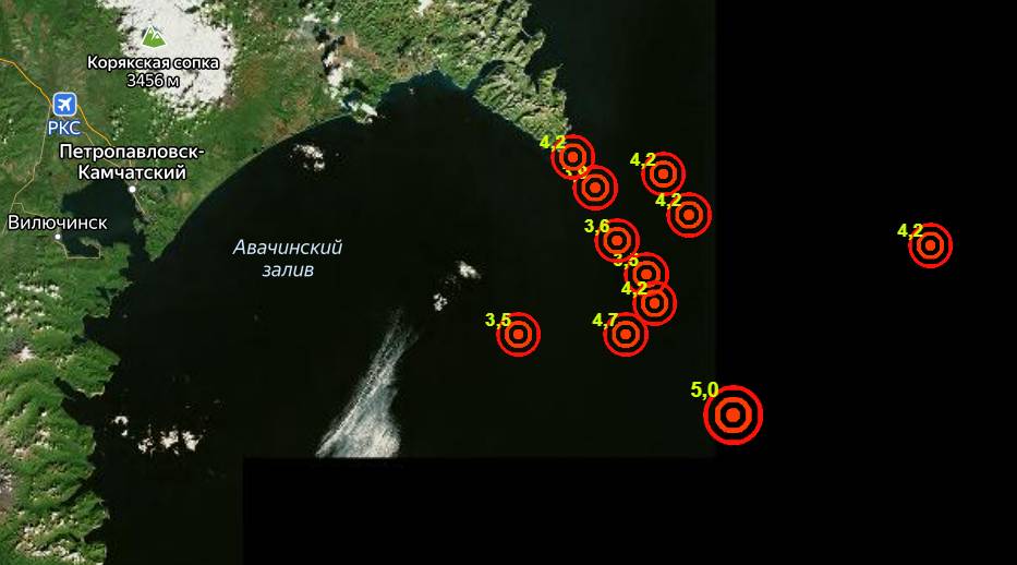 Поднимаемся севернее и видим аж 11 землетрясений величиной до 5 баллов относительно недалеко от Петропавловска-Камчатского на дне моря. Это говорит о том, что в регионе повышеная сейсмическая активность.