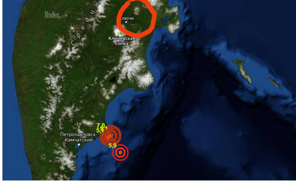Обратите внимание, вулкан Шивелуч находится на приличном расстоянии от эпицентра землетрясения в 7 баллов, однако тряска его «разбудило». Это было весьма эпично и жутко - огеннная лава, пепел и молнии. Что может быть при 9-бальном катаклизме и представить страшно.