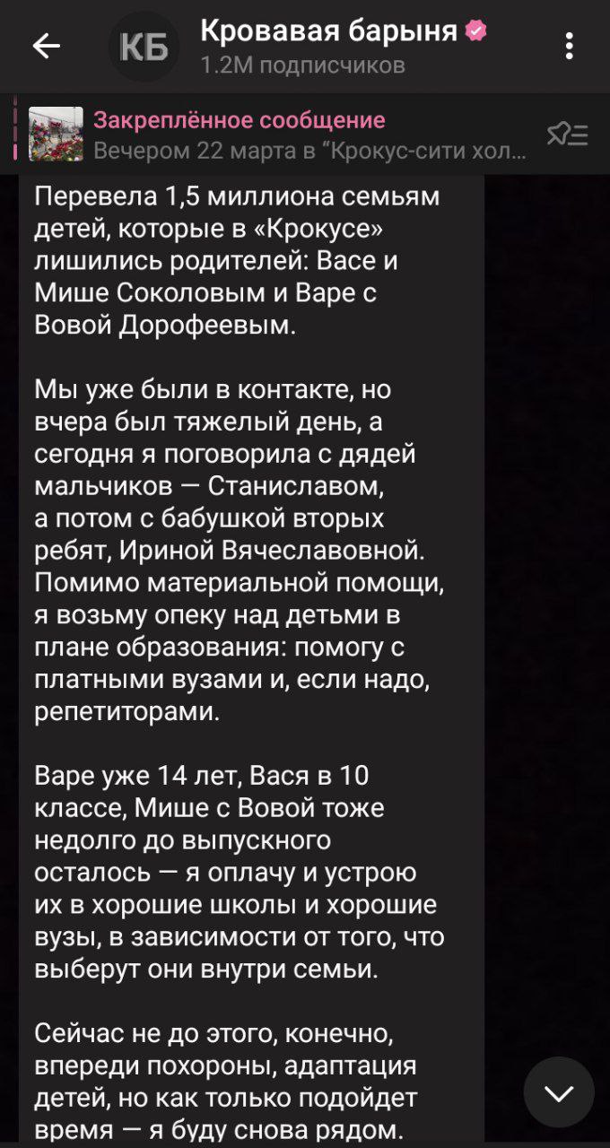 В своем Собчак заявила, что перевела семье детей Дорофеевых, лишившихся родителей во время террористического акта в «Крокус Сити Холл» 1,5 миллиона рублей. Как сообщает Собчак, она возьмет опеку над детьми в плане образования: оплатит обучение в ВУЗе и, если понадобится, репетиторов.