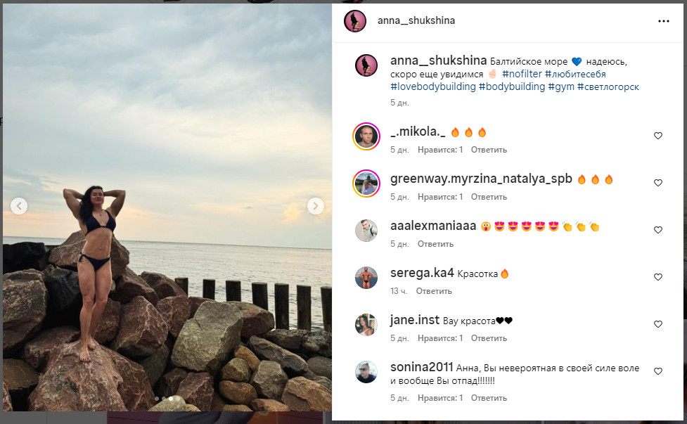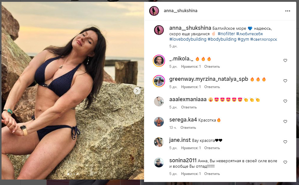 Девушка выглядит мощной, как и положено бодибилдерше, но в то же время женственной, а отсутствие косметики только подчёркивает красоту её лица. Также, Анна оставила комментарий под публикацией, где выразила надежду ещё раз встретится с Балтийским морем.
