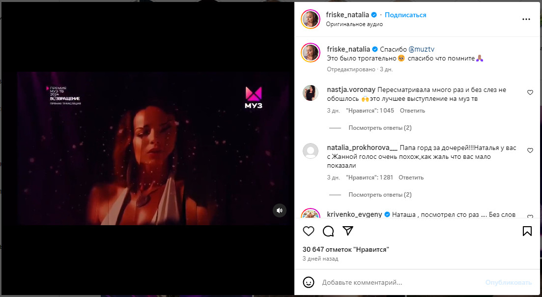 «Вы правда очень похожи на сестру, я не вижу ничего плохого в этом! Думаю, когда вы выступаете все немного утоляют жажду по Жанне!!! Мы очень скучаем по ней… Мне кажется вам надо петь её песни, хотя бы иногда. Не слушайте никого, вы классная!» – написал поклонник певицы в микроблоге Натальи.