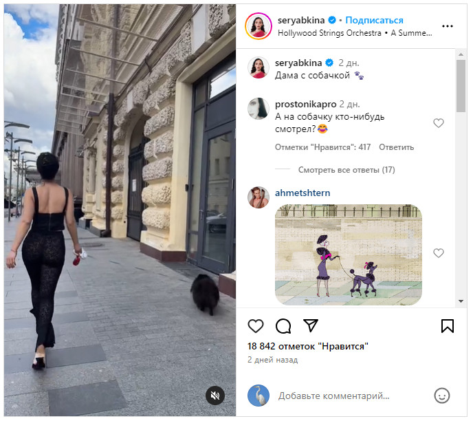 В таком пикантном наряде, звезда отправилась на прогулку со своим питомцем, небольшим и очаровательным шпицем. Свой пост Серябкина дополнила комментарием – «Дама с собачкой». Разумеется, поклонники не смогли пройти мимо горячих кадров и сразу заполнили блог певицы самыми разными комментариями.