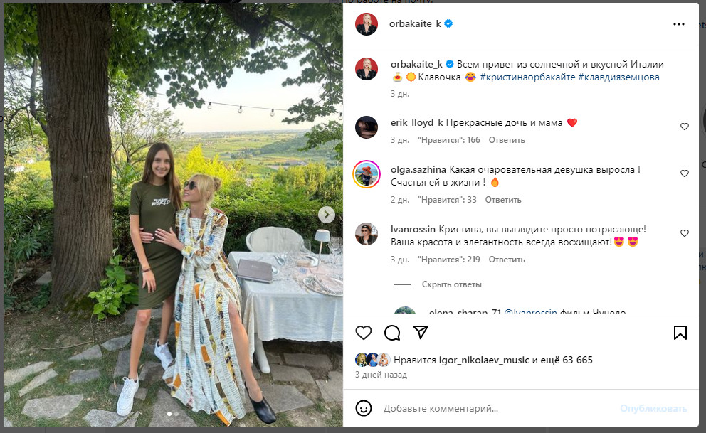 Орбакайте любит путешествовать и берёт в поездки свою наследницу. На данный момент Кристина и Клавдия проводят время среди восхитительных пейзажей солнечной Италии. Именно там, в жаркой стране мать и дочь сделали серию совместных снимков.