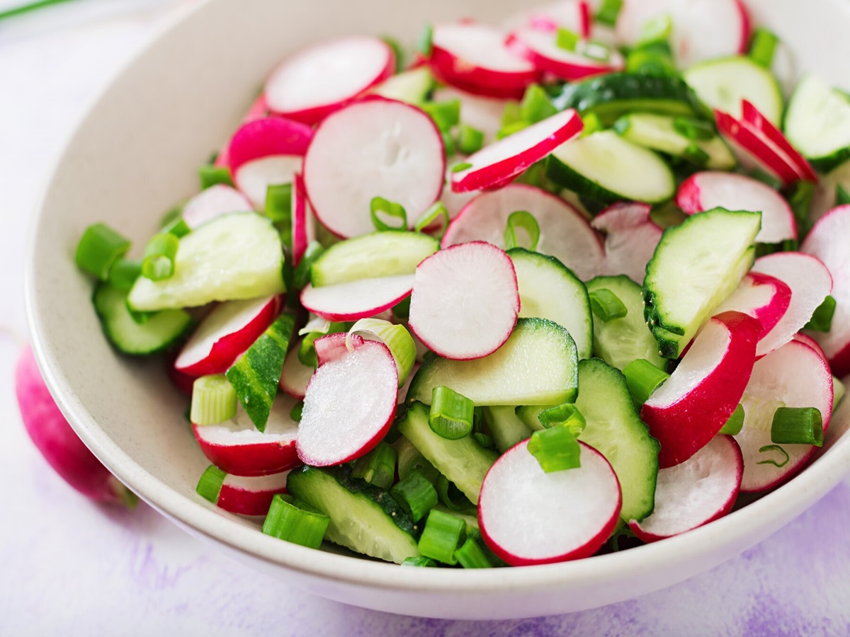 - редис и огурец следует нарезать небольшими брусочками. Черемшу можно мелко нашинковать.