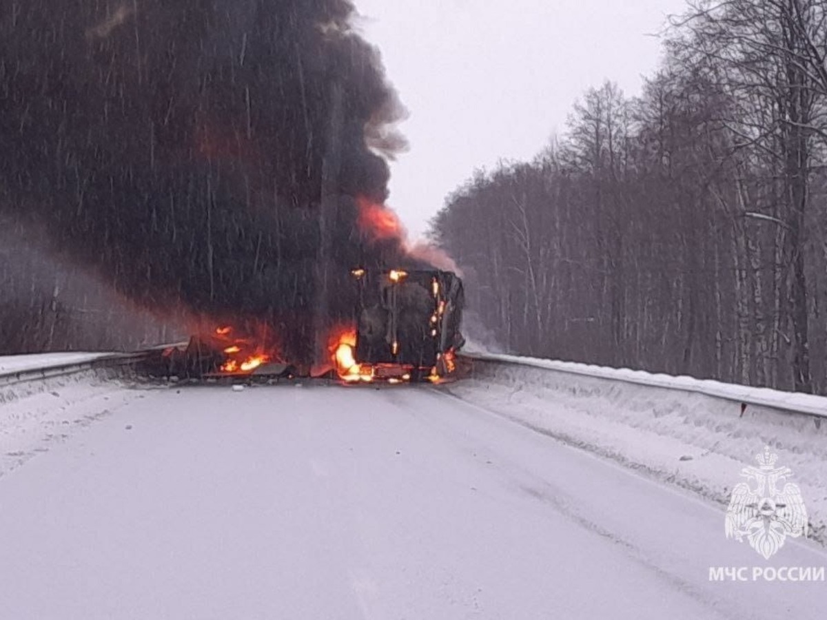 По предварительным данным, погибли двое. Сотрудники МЧС продолжают тушить пожар, движение по трассе перекрыли.