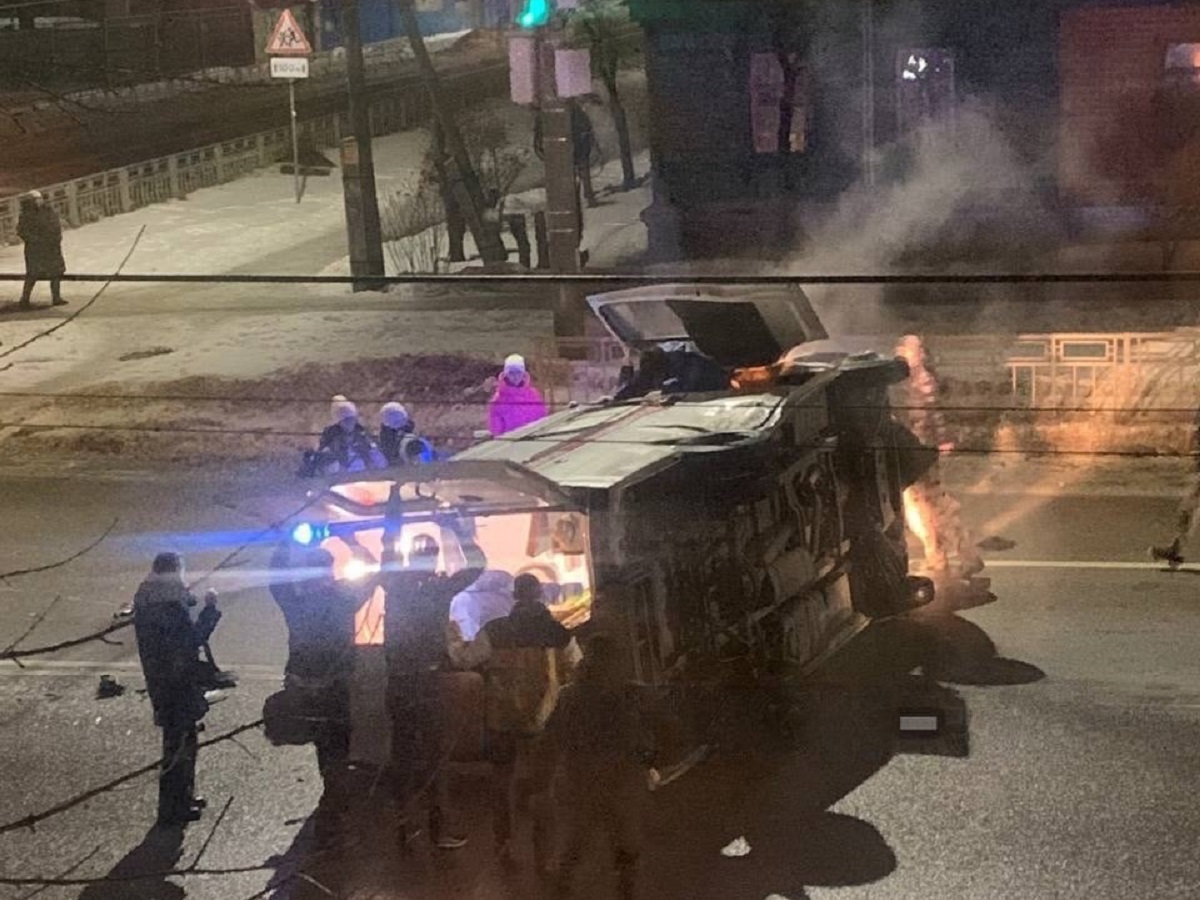 Авария произошла около школы №29 в 19:20, «скорая» от сильного удара опрокинулась. Видео и фото последствий ДТП опубликовали в «Мой и твой Воронеж».