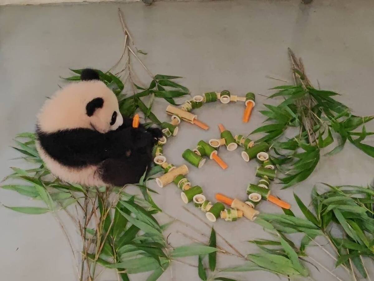 Панда Катюша, позируя на камеру, «победила» все бамбуковые листья на ветке