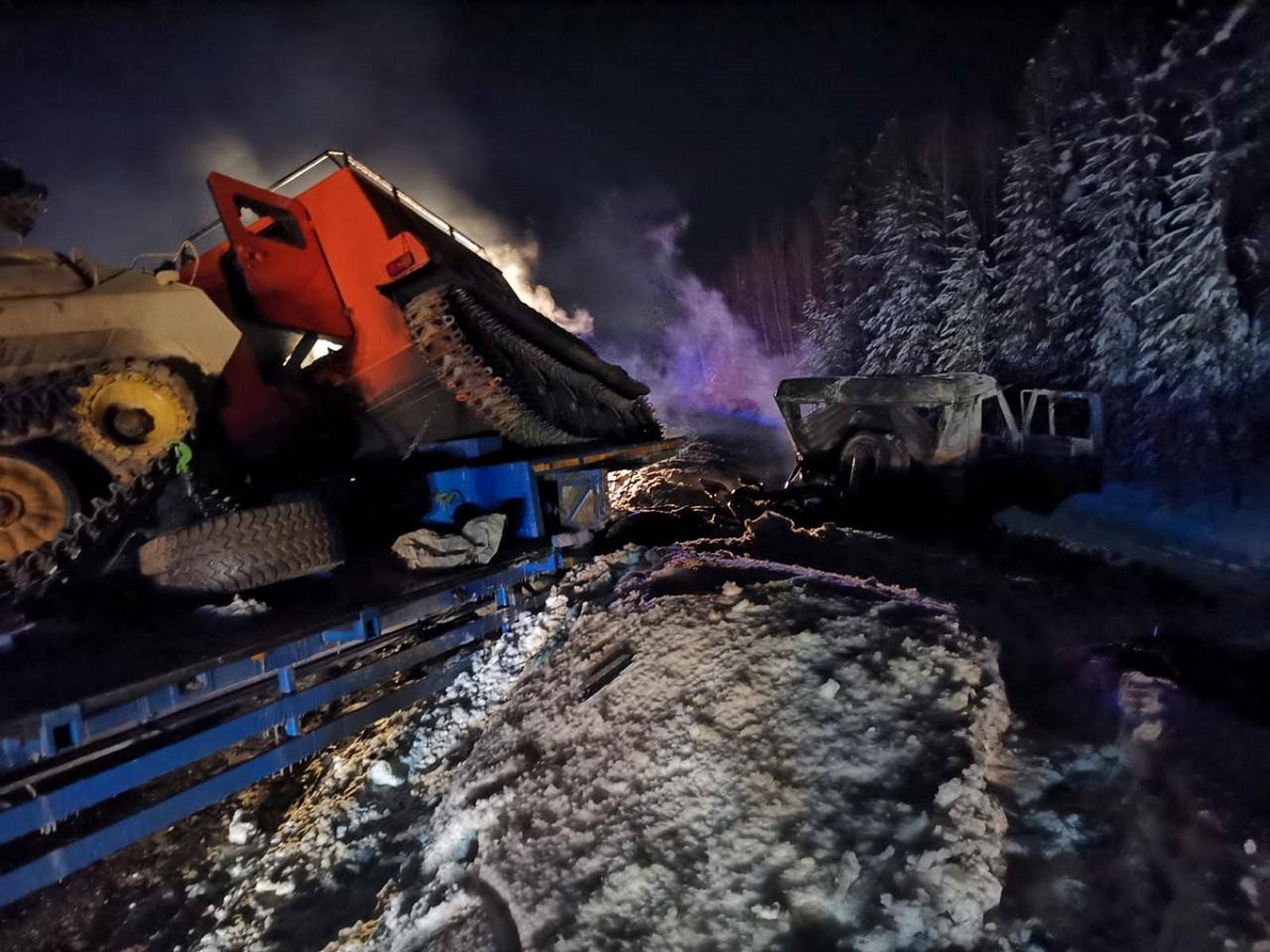 После этого МАЗ выехал на полосу встречного движения и там столкнулся в КамАЗ. Оба грузовика вспыхнули, шофер и пассажир МАЗа не выжили. На место ЧП выезжали полицейские, спасатели и медики. Сейчас правоохранители ведут проверку.
