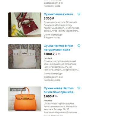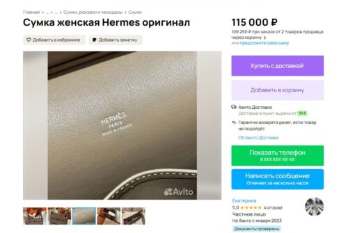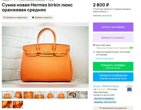 За границей аксессуары от элитных домов моды — это вложение денег, как, например, в золото или драгоценные камки. Владелица заветной Birkin в любой момент может ее выставить за цену вдвое выше той, за которую покупала. Любая женщина, которая «стоит в очереди» на элитарную сумку, «схватит» ее, чтобы не ждать полгода, а то и несколько лет. Поэтому появление настоящей Hermes на общедоступном интернет-сервисе за несколько десятков тысяч рублей — более, чем странно, и отношения к реальности имеет мало.