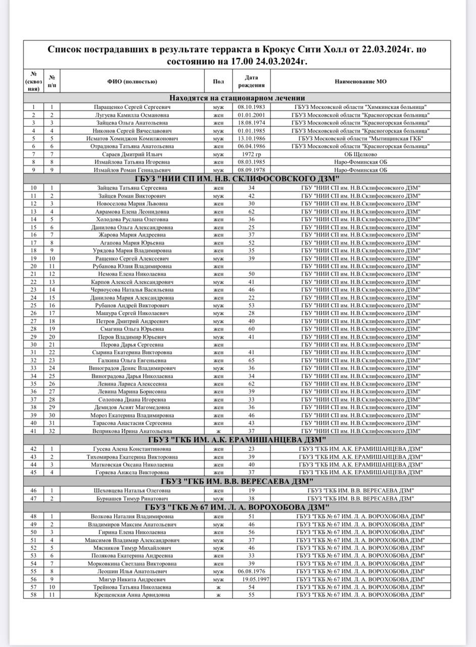 Минздрав Подмосковья обновил списки пострадавших в «Крокус Сити Холле»