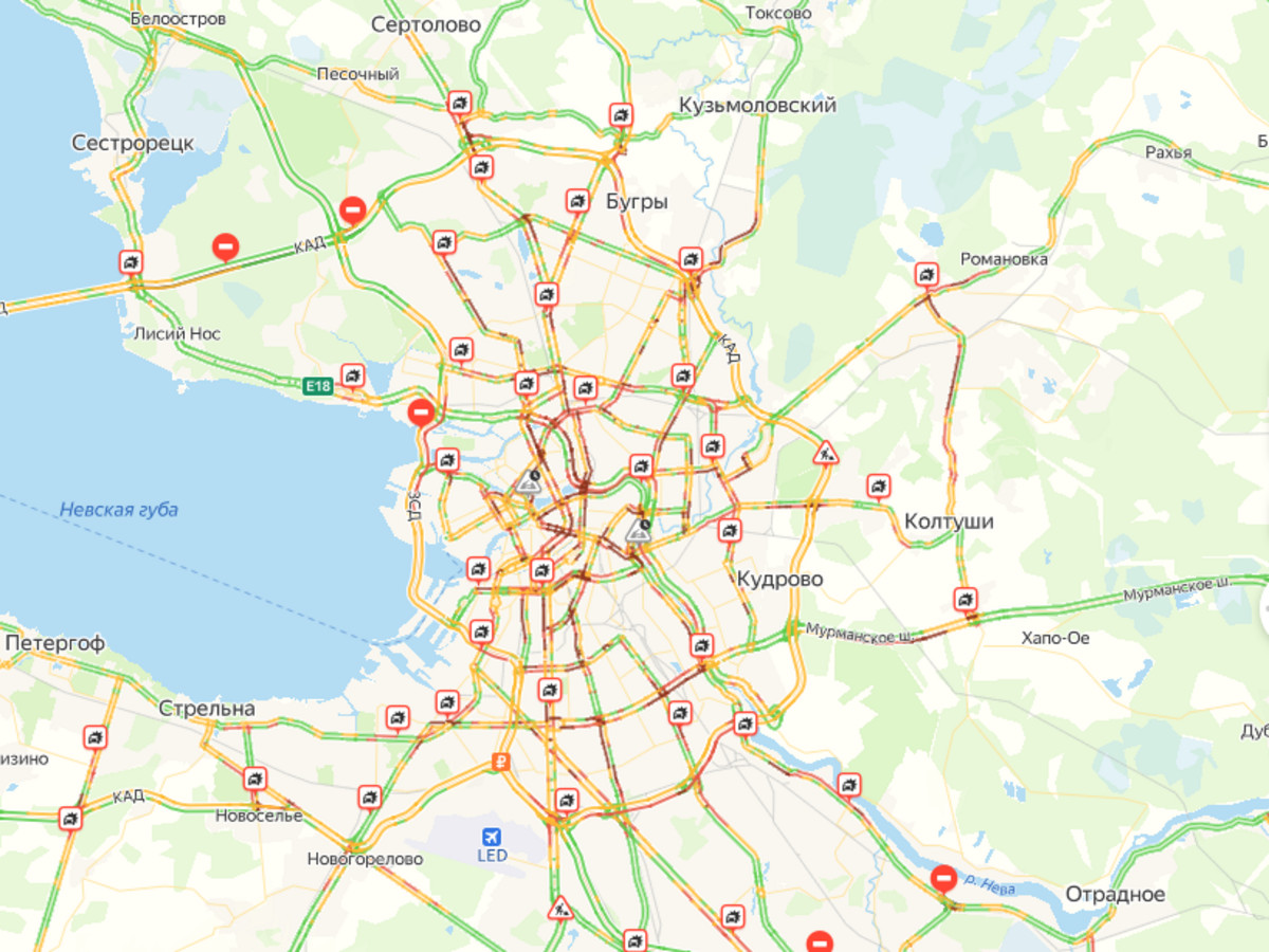 На Пироговской, Выборгской и Ушаковской набережных наблюдается чрезвычайно плотная пробка, что является необычным явлением. Еще один затор начинается с Литейного моста и заканчивается спустя 4,8 километра, на улице Академика Крылова. Вместо привычных 28 минут, преодоление этого участка может занять час.