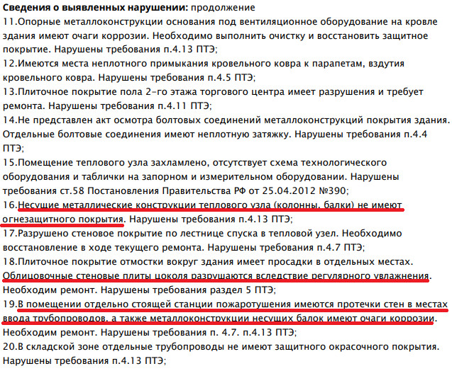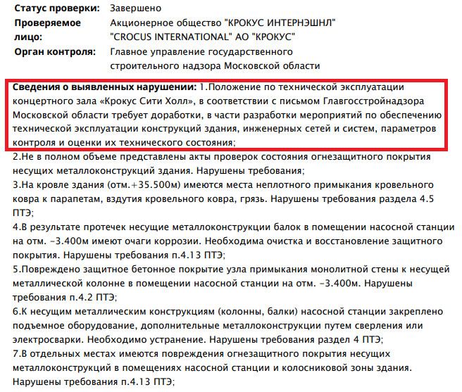 «Положение по технической эксплуатации концертного зала «Крокус Сити Холл» (прим. — расположенный в ТРК «Vegas Крокус Сити»), в соответствии с письмом Главгосстройнадзора Московской области требует доработки, в части разработки мероприятий по обеспечению технической эксплуатации конструкций здания, инженерных сетей и систем, параметров контроля и оценки их технического состояния», — говорится в отчете.