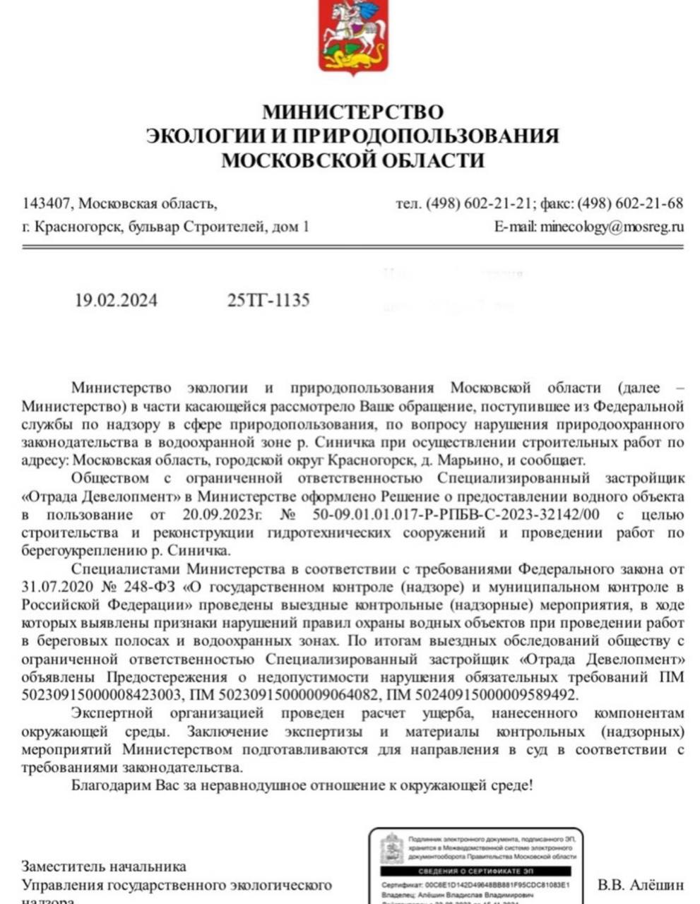 В итоге стройка началась, жалобы от жителей двух поселков шли уже во все инстанции. Прокуратура Московской области даже дала ответ, в котором признает нарушение природоохранного законодательства застройщиком, но только это. «Отрада Девелопмент» было выдано предписание, и нарушения были устранены, говорится в официальном ответе.