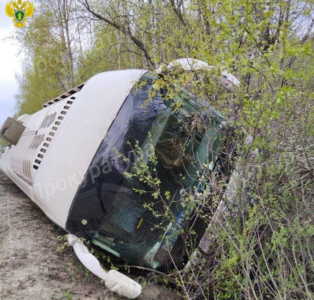 На место выезжали сотрудники УГИБДД и МЧС. После чего на место происшествия был вызван кран. Он поднял и поставил автобус на колеса.