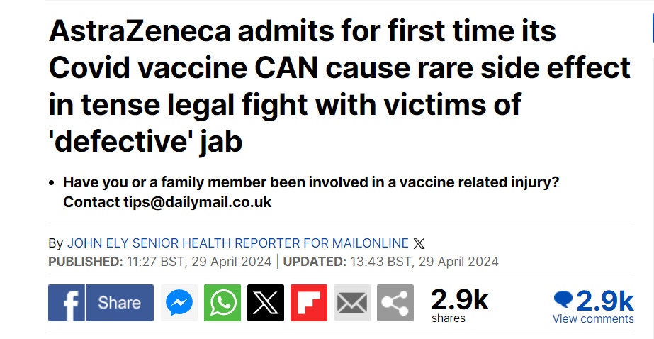 Фармацевтическая компания AstraZeneca после многочисленных исков была вынуждена признать, что ее вакцина от Covid-19 имеет серьезные побочные явления, а точнее она вызывает свертывание крови и тромбоз.