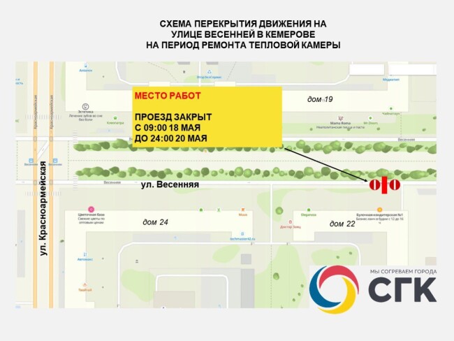 В отделе по работе со СМИ СГК Кузбасса 16 мая сообщили, что на улице Весенней будут ремонтировать теплотрассу. Из-за этого введут ограничения.
