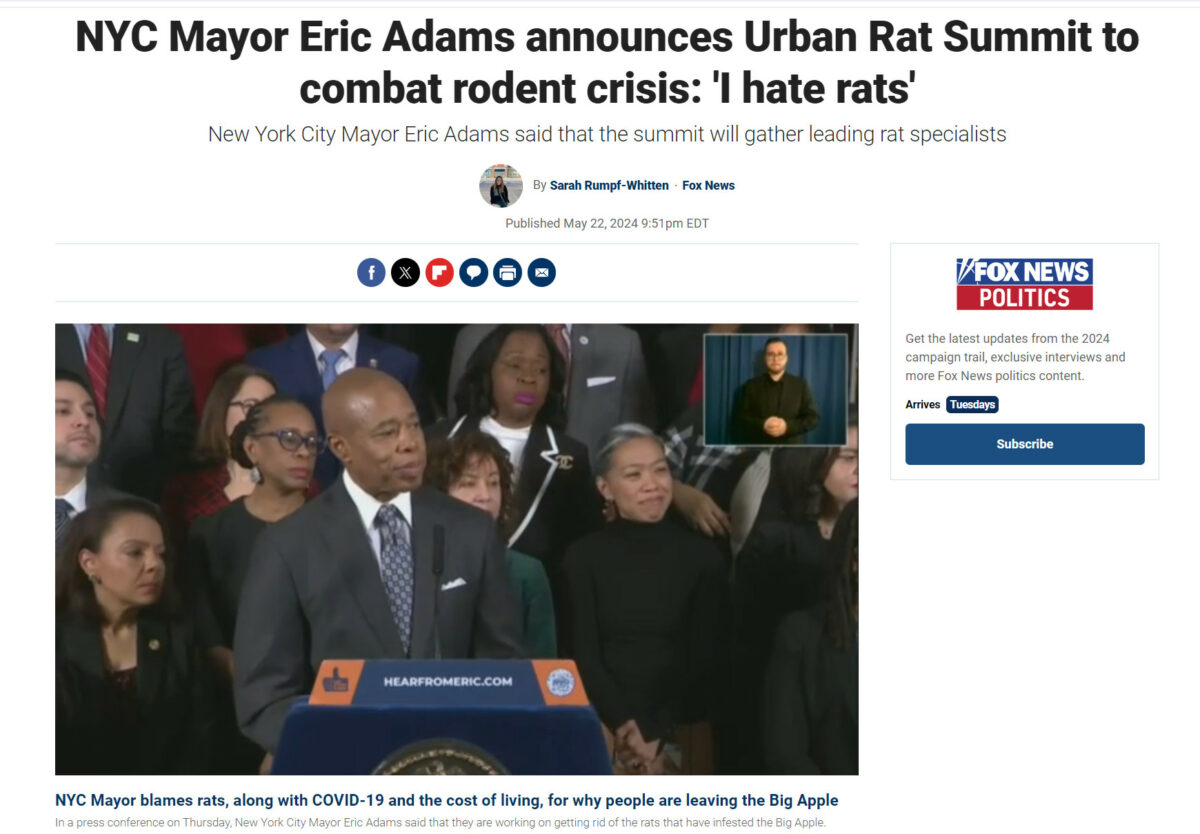 Проблема приняла такой огромный масштаб, что мэр Нью-Йорка Эрик Адамс объявил о проведении первого Национального крысиного саммита, на который должны собраться самые лучшие представители по борьбе с грызунами из Бостона, Сиэтла и Нового Орлеана.