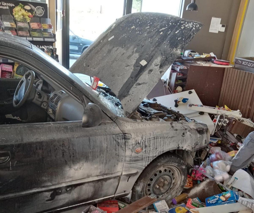 Инцидент произошел сегодня, 10 июня, примерно в 7:40. Водитель автомобиля «Акцент» не справился с управлением и врезался в стеклянную витрину здания АЗС.