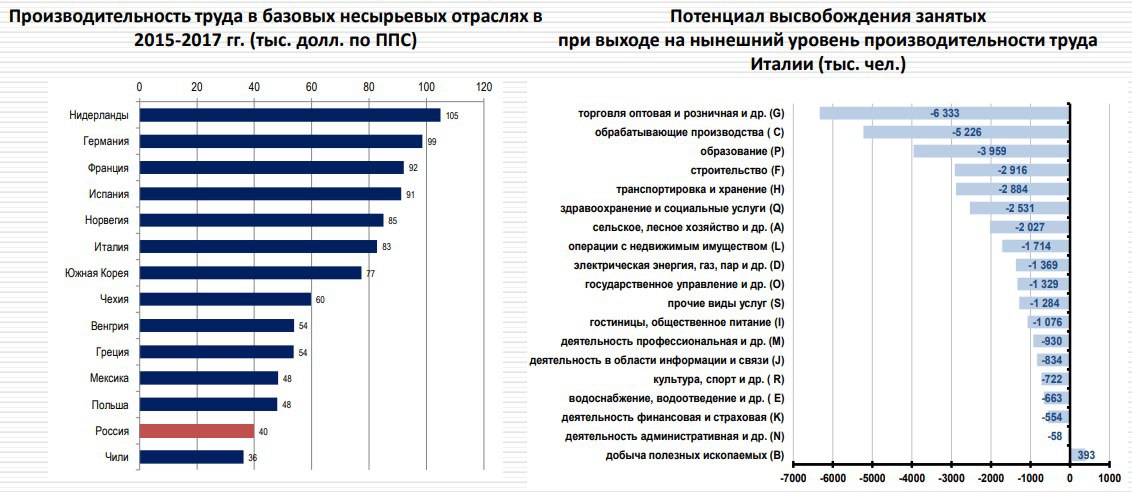 Для сравнения он привел данные о производительности труда в России и Италии, европейской страной, в которой по статистике не самая высокая производительность труда. Если в России добиться хотя бы подобной производительности труда, то под угрозой увольнения окажется 25 млн. человек!!!