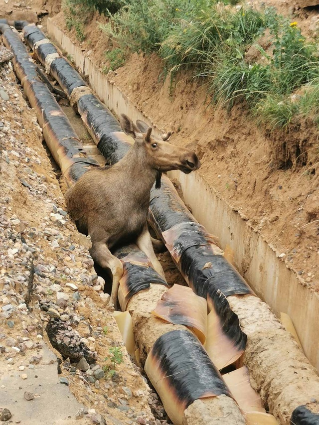 20 июля лось снова попал в беду. В Заволжье на Студенческом проезде, 9 сохатый свалился в траншею, которую выкопали на время ремонта теплосетей, и намертво застрял в узкой яме.