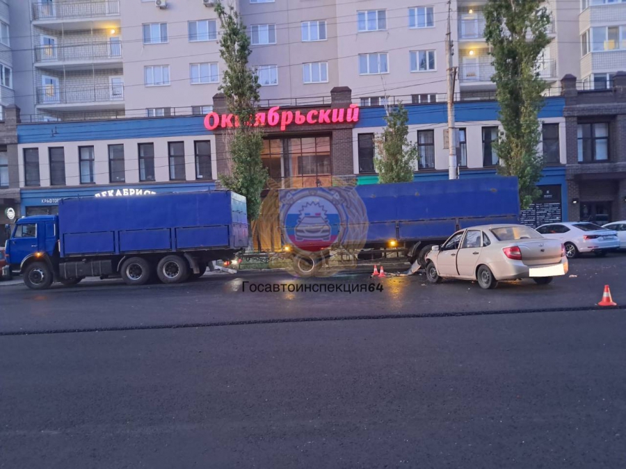 В Октябрьском районе Саратова за полночь 26 июля произошло столкновение двух легковушек и припаркованного грузовика «КамАЗ»