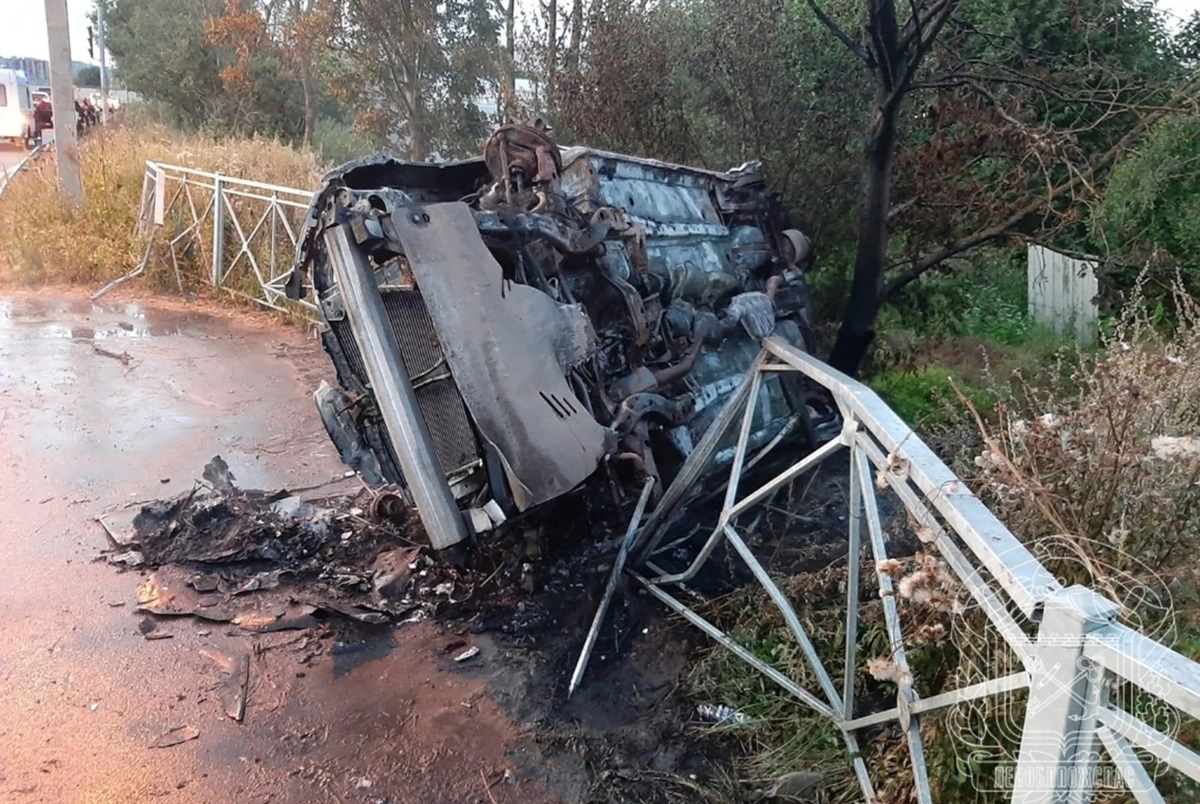 Водитель и семеро пассажиров смогли эвакуироваться из пылающего салона. Никто не пострадал, но автобус полностью выгорел.