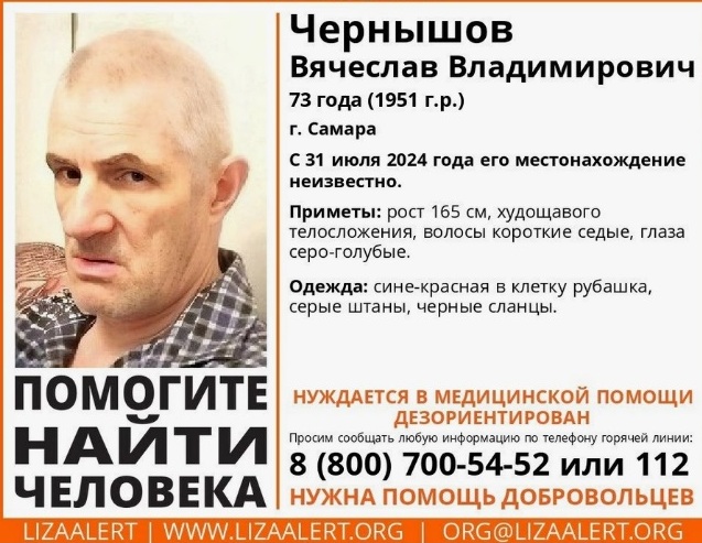 По словам родственников пропавшего Вячеслава Чернышова, пожилой мужчина был одет в сине-красную рубашку в клетку, серые штаны и черные сланцы. Рост пенсионера 165 сантиметров, он худощавое телосложение, волосы седые короткие, глаза серо-голубые.