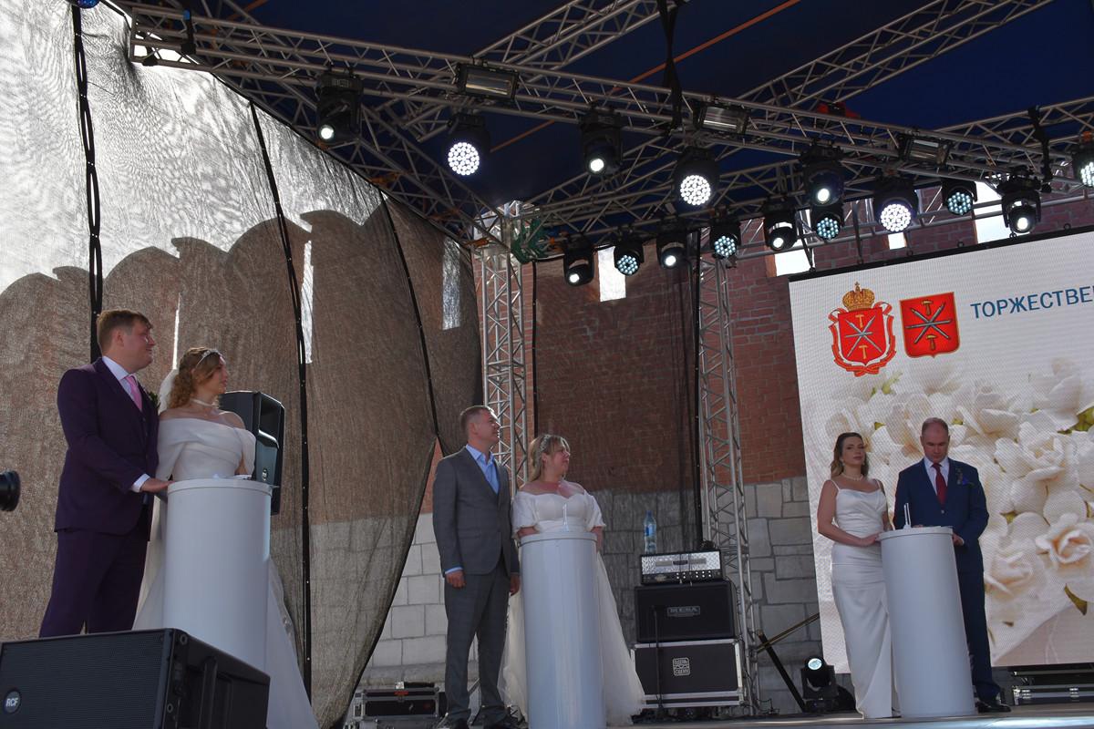 В День города решили расписаться пять пар влюбленных. Сделали они это на глазах гостей праздника прямо на сцене Казанской набережной.