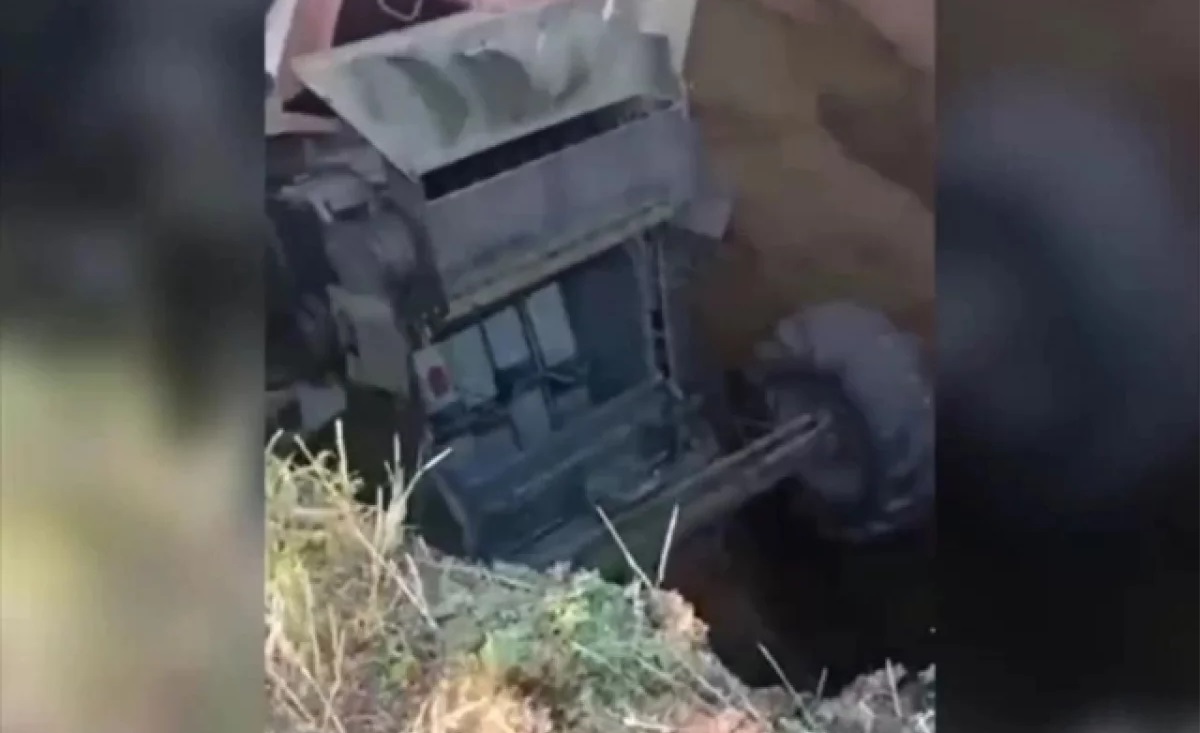 Трагедия попала в кадр, канал представил страшное видео. В кадре можно увидеть лежащий на дне воронки комбайн. Снимающий видео говорит, что это карстовая воронка. Ее глубина составляет порядка 10 метров.