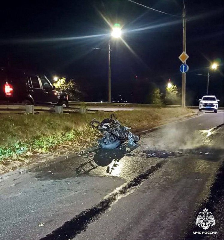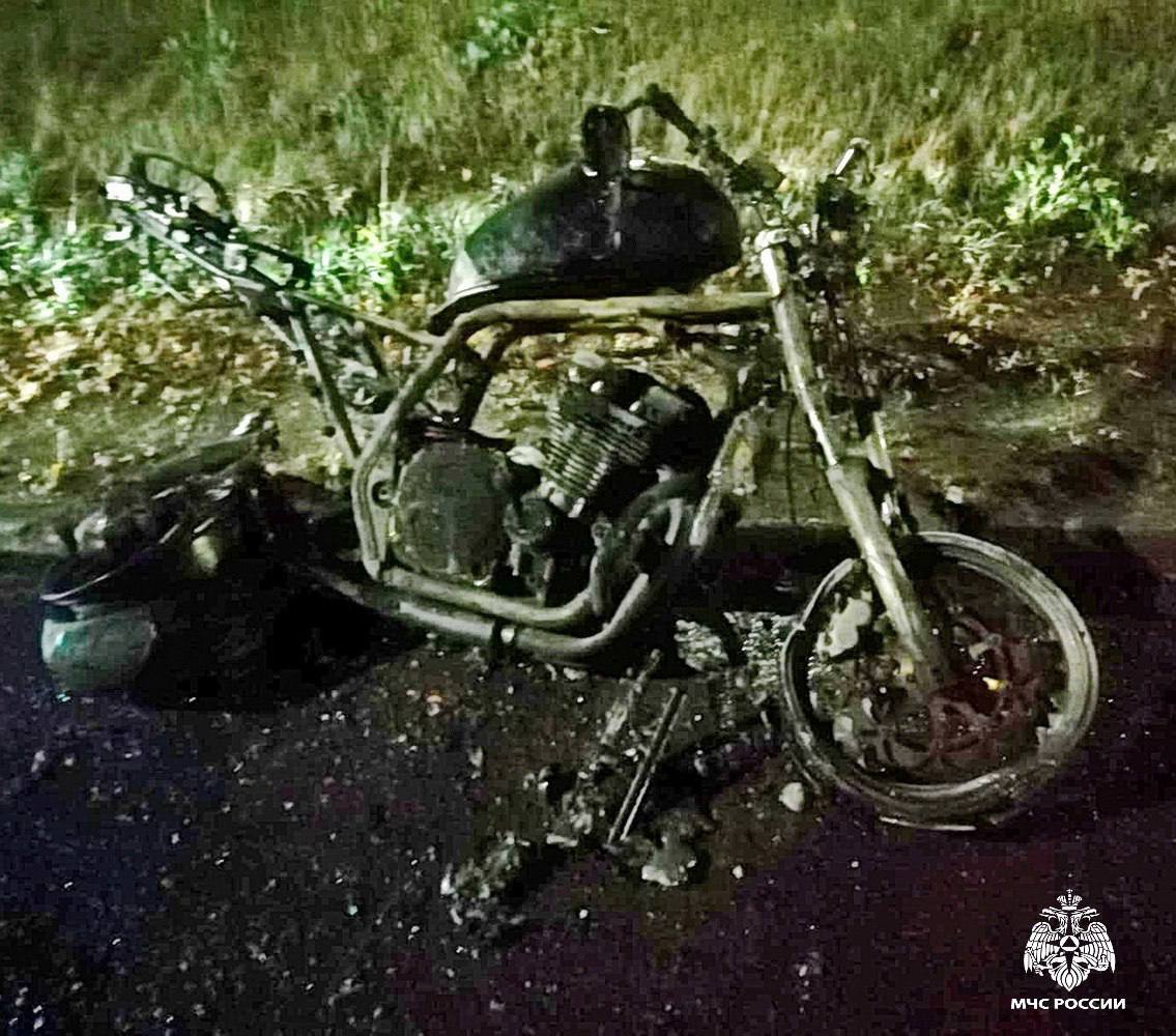 ДТП произошло в темное время суток в Смоленске. Мотоциклист на байке спортивной модели двигался по автодороге, когда на скорости у него лопнуло колесо. Технику стало заносить. Все еще на высокой скорости байк вбило в бордюр. Препятствие остановило мотоцикл, он завалился на бок и загорелся.