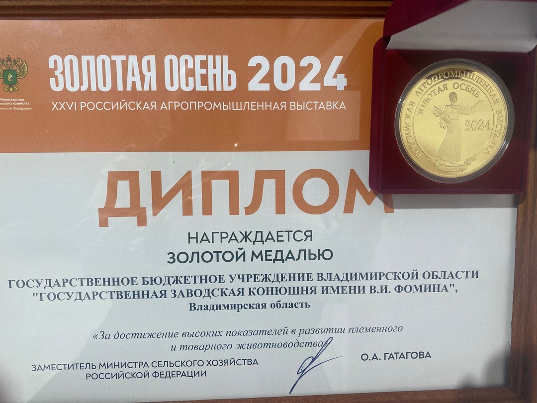 По итогам конкурса, объявленного департаментом животноводства и племенного дела Минсельхоза России, наши предприятия награждены дипломами и медалями за достижение высоких показателей в развитии племенного и товарного животноводства. Кобыла Богиня ГЗК имени В.И. Фомина отмечена золотой медалью выставки «Золотая осень» и Кубком международной конной выставки «Конная Россия». Ковровское сельхозпредприятие «Муравия» на «Золотой осени - 2024» представило две коровы голштинской породы и получило серебряную медаль, впечатлив экспертов высокими показателями.