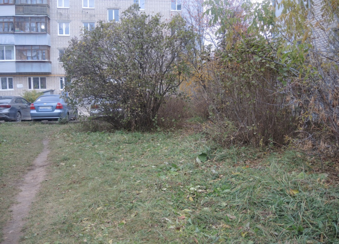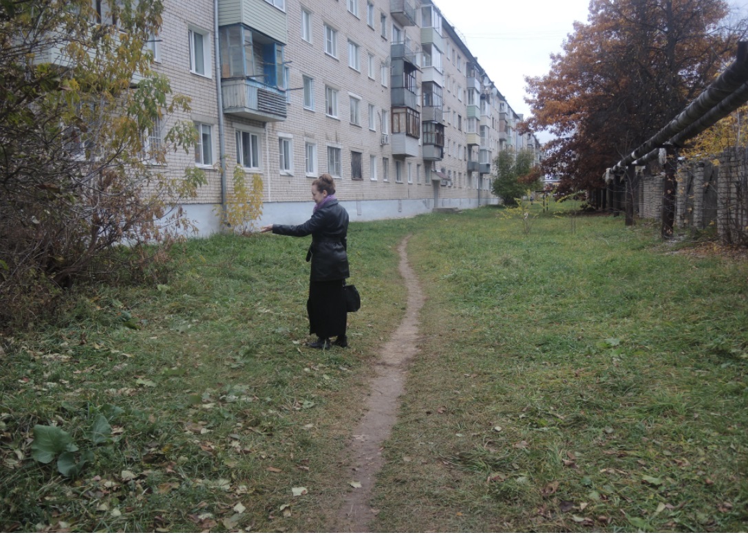 Место весьма немноголюдное — вдоль дома расположены кусты и трава, а из конца в конец идет тропинка. Из-за глухого забора детского сада и вовсе ничего не видно.