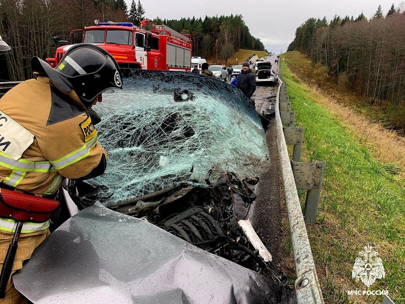 На место ЧП выезжала бригада спасателей при поддержке автоцистерны 51 ПСЧ. Возгорания не произошло. Одну из жертв аварии спасатели из металлической ловушки – его зажало в раскуроченном авто.