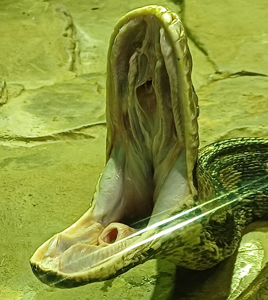 Питон так же высунул язык – но уже три раза! – и мы долго смотрели глаза в глаза, словно гипнотизируя – кто кого. Потом змей резко распахнул пасть. Да так, что я увидел в ней бездну – «щёки», «зубы», «гланды», какую-то потайную «ракетную» трубу... Ощущение – ещё секунда и проглотит (тебя, врагов, континент?). К счастью, я успел его сфотать…