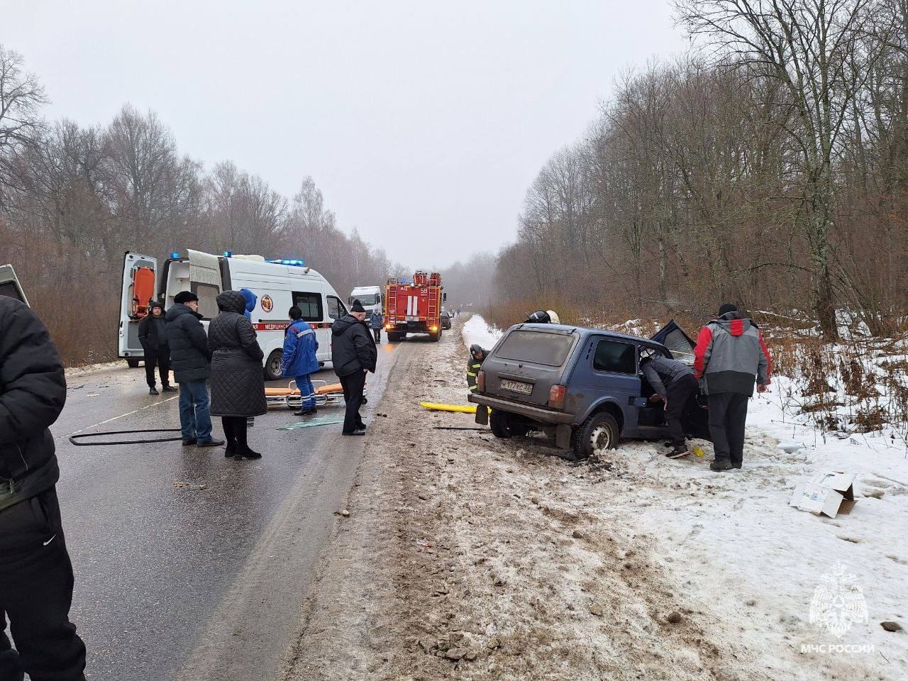У «Нивы» смята вся передняя часть. Водитель оказался зажат в кабине. Ему на помощь пришли спасатели.