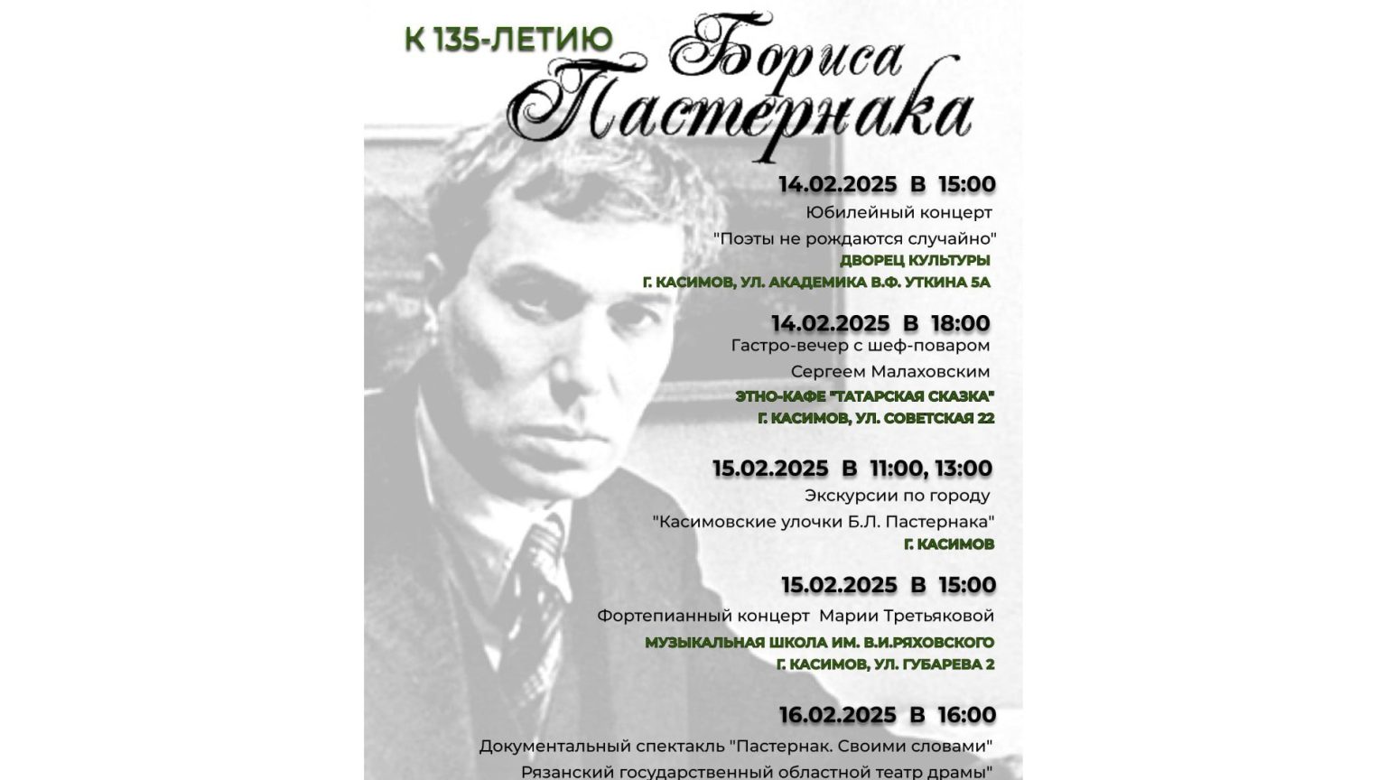 К юбилею поэта подготовлена насыщенная программа мероприятий, которая пройдет с 14 по 16 февраля. 14 февраля в 15:00 в Дворце культуры (ул. Академика В.Ф. Уткина, 5а) состоится концерт под названием «Поэты не рождаются случайно», где будут представлены произведения Пастернака в исполнении талантливых артистов. В 18:00 в этно-кафе «Татарская сказка» (ул. Советская, 22) пройдет гастрономический вечер с шеф-поваром Сергеем Малаховским*, который предложит уникальные блюда, вдохновленные творчеством поэта.