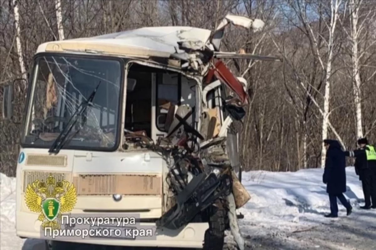 В Приморском крае 15 пассажиров рейсового автобуса ПАЗ получили травмы в столкновении с прицепом лесовоза в Чугуевском районе