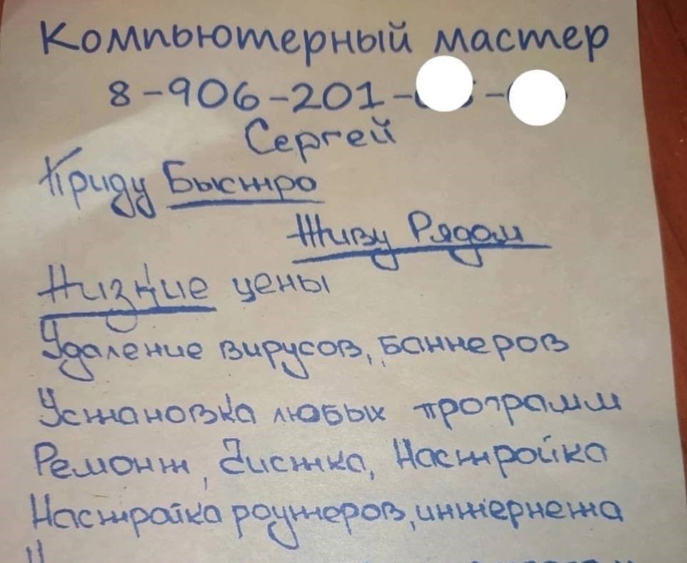 Это те самые люди, которые на протяжении длительного времени закидывали почтовые ящики новгородцев своими рекламными объявлениями с предложением услуг всесильных «компьютерных мастеров», которые могут всё: и удалить вирусы, и установить программы, и создать сайты любой сложности. Что подкупало? Красивый почерк на, казалось бы, рукописных текстах, создававших иллюзию чего-то своего, домашнего, надёжного. А также непременные гарантии того, что всё честно и недорого: «Приду быстро. Живу рядом. Низкие цены. Работаю без выходных».