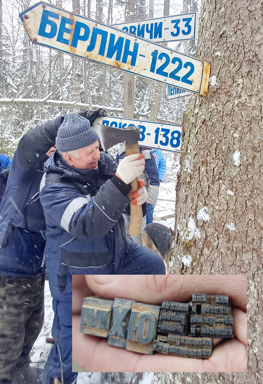 Вместе с нами в десанте находились и обнаруженные ранее раритеты военной типографии – партизанские заголовочные и печатные литеры, верстатка, а также фотоаппарат «Ленинград», потерянный кем-то из таких же следопытов 70-80-х годов. Нашёл журналистскую святыню прошлым летом ас-водитель вездехода, внук возницы партизанского обоза Василий Константинович АЛЕКСАНДРОВ.
