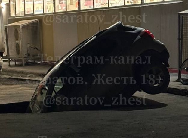Как пишут жители города Энгельс, вечером возле магазина «Магнит» на парковке на улице Молодежной иномарка передней частью ушла под асфальт, а задняя часть осталась снаружи. О пострадавших не сообщалось.
