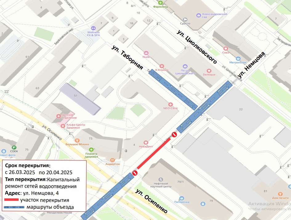 Департамент дорожной инфраструктуры и транспорта администрации города Тюмени информирует о том, что в городе Тюмени в период с двадцать шестого марта по двадцатое апреля у дома номер четыре по улице Немцова будет перекрыта дорога. Объезд закрытого дорожного участка можно будет осуществить по улице Осипенко, Таборной или Циолковского.