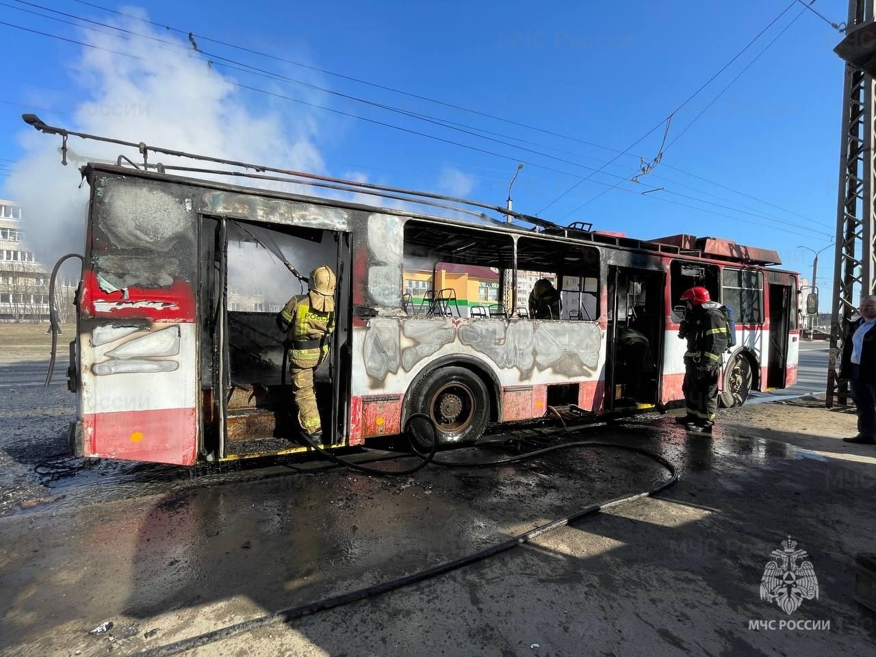 К счастью, никто из людей в результате случившегося не пострадал. Дознаватели МЧС в качестве предварительной причины случившегося назвали короткое замыкание силового кабеля, проходящего под днищем троллейбуса.