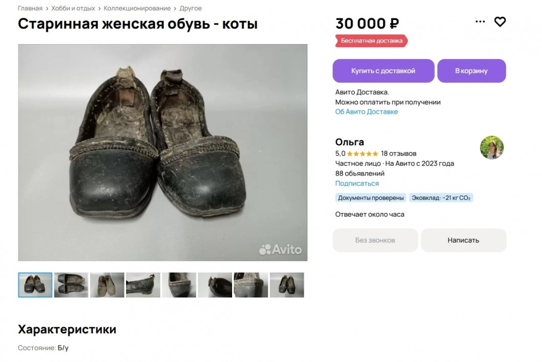 Согласно информации, опубликованной в тексте объявления старинная женская обувь – коты была изготовлена в Воронежской, Белгородской губернии в XIX веке. Обувь предназначалась для нахождения в музейных экспозициях и частных коллекциях. Среди зажиточных русских крестьян, живших в ХVIII – начале ХХ века, коты, представляющие собой открытые, кожаные туфли на подошве и каблуке, c жестким носком и задником, пользовались особой популярностью. Пошив котов осуществлялся из грубой чёрного цвета кожи и на прямую колодку. В связи с пошивом на прямую колодку для правой и левой ноги туфли выглядели идентично. Иногда пошив котов осуществлялся «на косую».