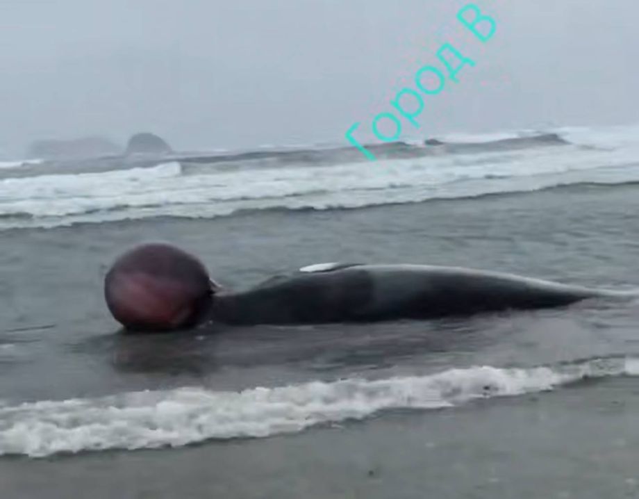 Кита со вздувшейся головой выкинуло в шторм на берег Приморья