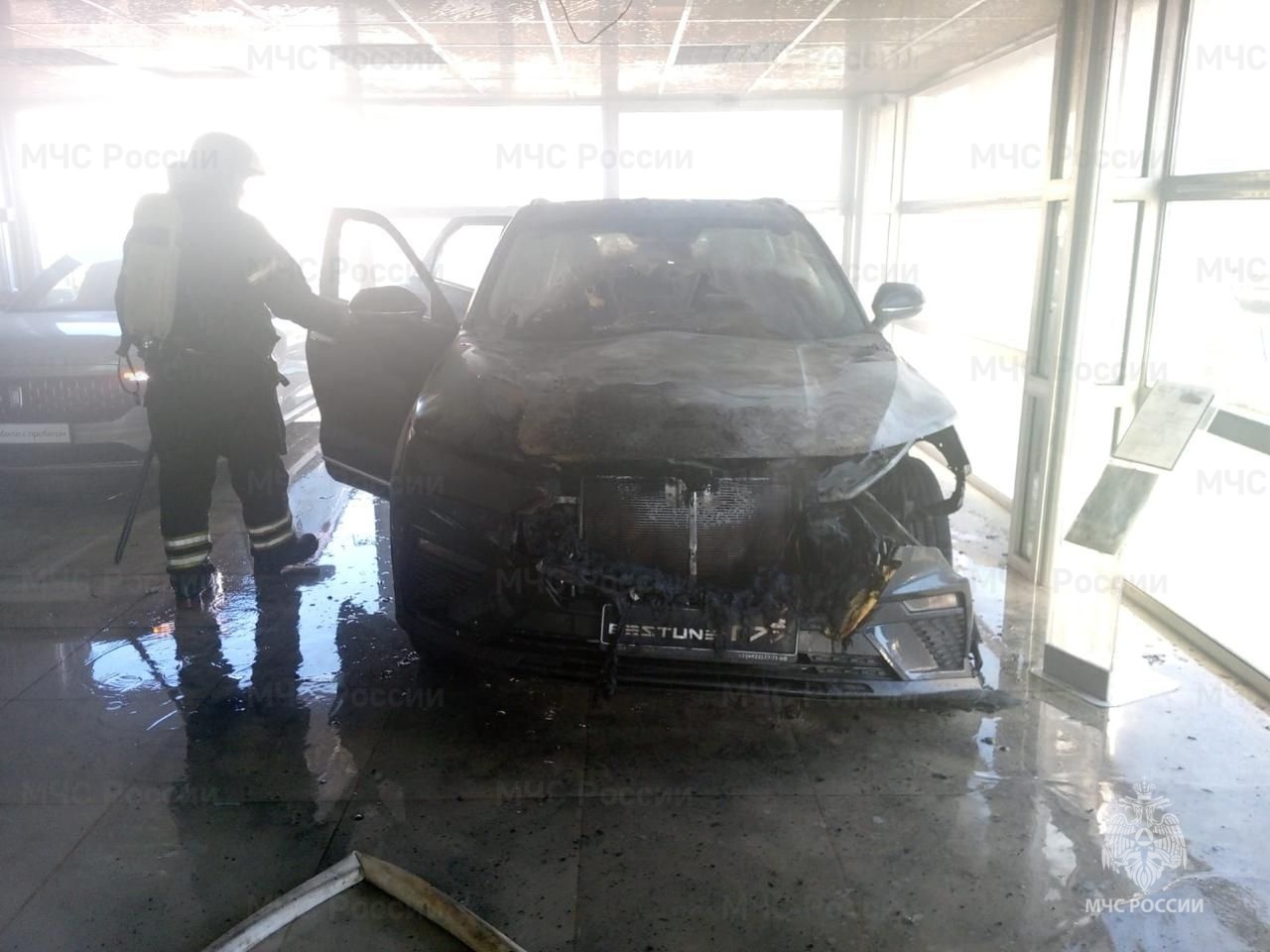 По приезду на место обнаружилось, что пожар вспыхнул в моторном отсеке китайского кроссовера «Бестюн». Автомобиль быстро потушили, выгоревшая площадь моторного отсека составила 4 квадратных метра. Кроме того, на площади 5 квадратных метров пострадали отделка автосалона и находившиеся поблизости предметы. К счастью, никто из людей не пострадал.