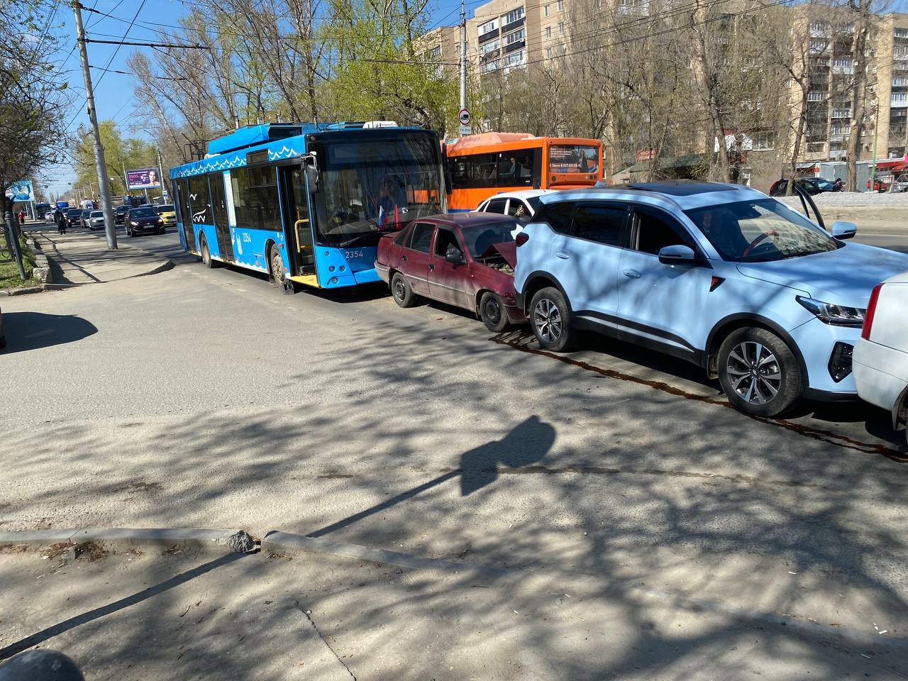 По словам очевидцев, на проспекте 50 Лет Октября «паровозиком» врезались троллейбус и пять легковых машин. Информацию подтвердили в Госавтоинспекции региона, по данным ведомства, у дома №3 столкнулись троллейбус маршрута №5А и автомобили Kia, два Renoult, Chery и Daewoo. Не обошлось без пострадавших, находящийся в Daewoo 33-летний мужчина получил травмы, его увезли в больницу.