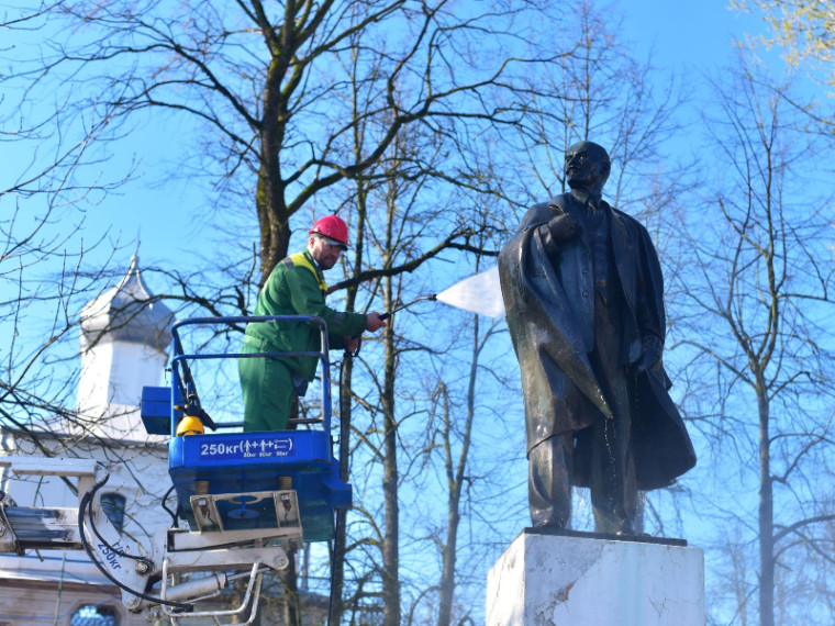 По информации начальника участка благоустройства этого учреждения Николая Фёдорова, процедуры по очистке памятников проходят регулярно: накануне дня рождения Ленина. В этом году специалисты использовали автовышку, чтобы обеспечить безопасный доступ к верхним частям монумента, установленного на площади Победы-Софийская.