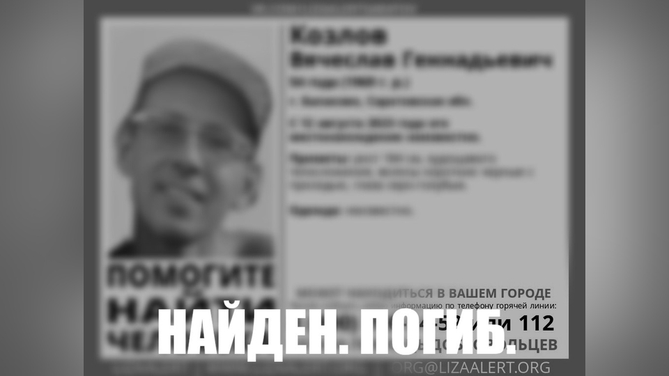 К сожалению, житель региона найден мертвым. Напомним, ориентировка на поиски 54-летнего Вячеслава Козлова появилась в конце лета 2023 года. Сообщалось, что с 12 августа о его местонахождении ничего известно. Только спустя два года было найдено его тело. Где он был обнаружен и какие причины привели к гибели мужчины, пока неизвестно.